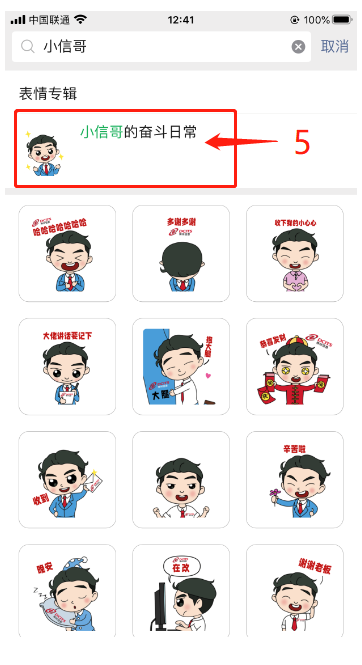 5、点击表情专辑“小信哥的奋斗日常”