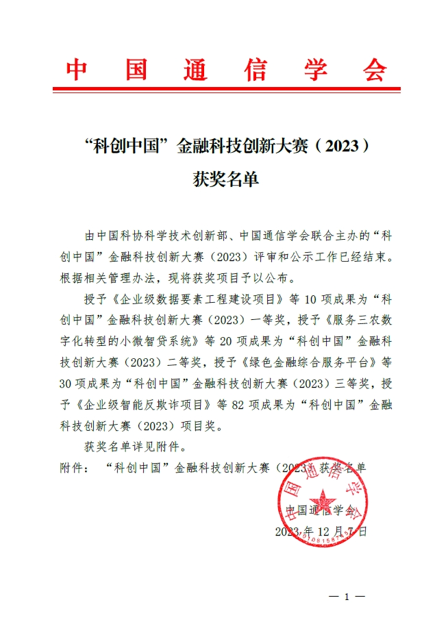近日,由中国科协科学技术创新部、中国通信协会联合主办的“科创中国”金融科技创新大赛(2023)公布最终结果,BB贝博艾弗森官网九天揽月·云原生金融PaaS平台项目荣获本次大赛三等奖。